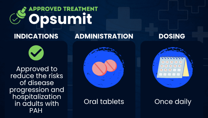 Opsumit (macitentan) is an oral medication approved to reduce the risk of disease progression and hospitalization in adults with pulmonary arterial hypertension (PAH).