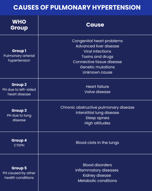 The World Health Organization classifies PH into five main groups based on the underlying cause.