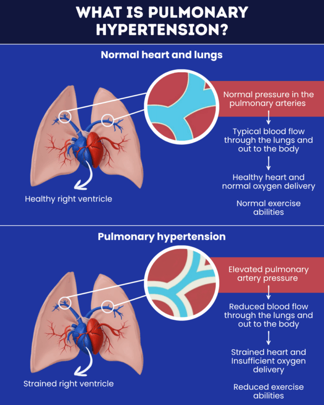 For people with these conditions, the heart has to work harder to pump blood through the lungs. This compromises oxygen delivery to the body and leads to heart strain or right heart failure.