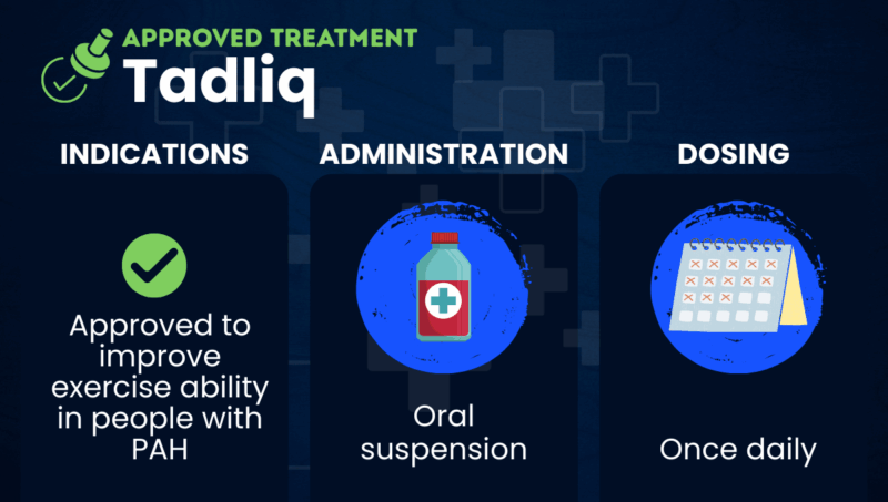 Tadliq is a liquid oral suspension formulation of tadalafil that’s approved in the U.S. to improve exercise ability in people with pulmonary arterial hypertension (PAH).