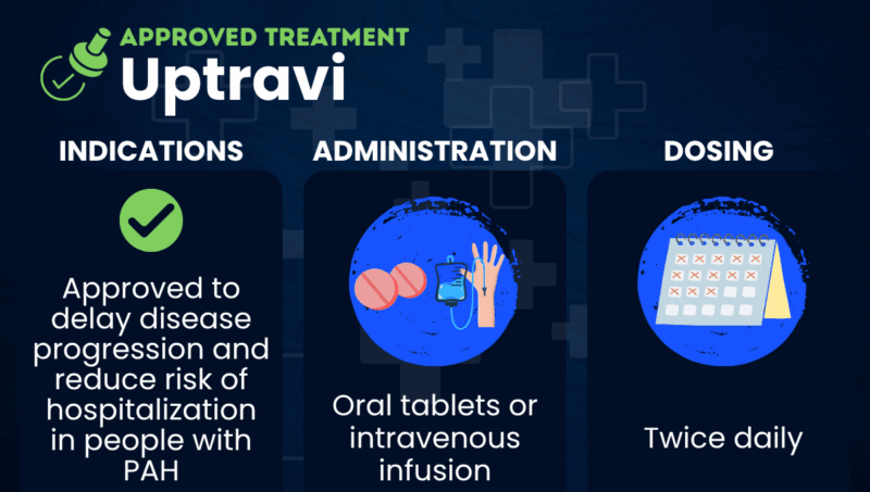 Uptravi (selexipag) is an approved therapy from Johnson & Johnson that’s used to delay disease progression and reduce the risk of hospitalization in people with pulmonary arterial hypertension (PAH). It is available in oral and intravenous (into-the-vein) formulations.