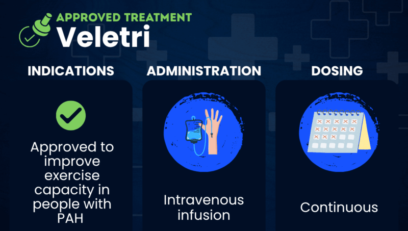 Veletri (epoprostenol) is an intravenous (into-the-vein) infusion therapy approved to improve exercise capacity in people with pulmonary arterial hypertension (PAH).